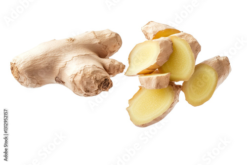 Fototapeta premium Piece of ginger root is cut in half and placed on a white background, isolated