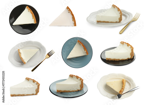 Obraz premium Pieces of tasty cheesecake isolated on white, set