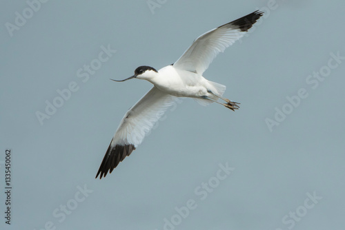 Obraz premium Pied Avocet (Recurvirostra avosetta) in flight against a cloudy sky