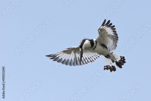 © Mathias Putze, Obraz premium pied kingfisher (ceryle rudis) hovering in the air and watching downwards for fish