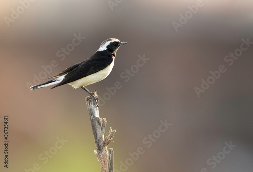 © Dr Ajay Kumar Singh, Obraz premium Pied wheatear perched on a log, Bahrain