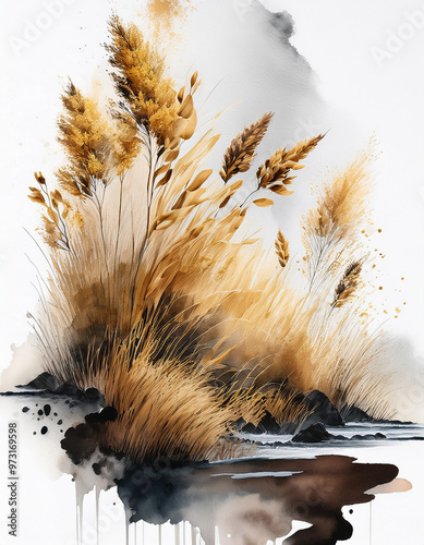 © Elżbieta Kaps, Obraz premium Piękna abstrakcyjna akwarela, na białym tle, jezioro z trzcinami i trawami, dekoracja tapeta generative ai
