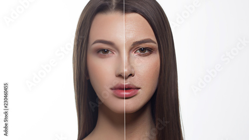 © evgeniyasht19, Naklejka premium Piękna brunetka przed i po. Pokazuje zmiany wieku, fałdy, zmarszczki kobiety. Prawa połowa twarzy w retuszu. Długie włosy i brązowe oczy. Spa, zastrzyki, kosmetologia, starzenie się, kosmetyki