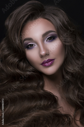 Fototapeta premium Piękna dziewczyna kaukaski z długimi falującymi i lśniącymi włosami. Brunetka kobieta z kędzierzawą fryzurą