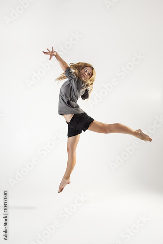 © Chepko Danil, Obraz premium piękna dziewczyna taniec na szarym tle