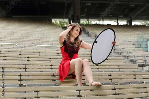© Stanisław Błachowicz, Obraz premium Piękna dziewczyna uśmiecha się w amfiteatrze.