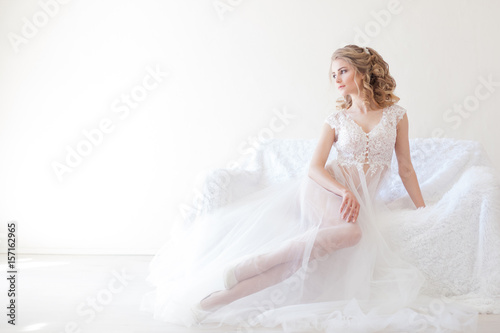 © dmitriisimakov, Naklejka premium piękna dziewczyna w bieliźnie siedzi na białej kanapie ślubu