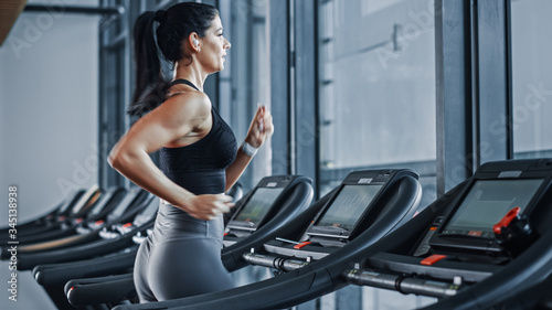 © Gorodenkoff, Fototapeta premium Piękna kobieta sportowa lekkoatletycznego nosząca słuchawki bezprzewodowe słucha podcastów lub listy odtwarzania muzyki sportowej podczas biegania na bieżni. Energiczny trening lekkoatletki na siłowni.
