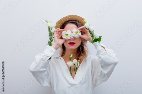 © Masson, Naklejka premium Piękna kobieta z białymi różami w rękawach w kapeluszu na białym backgroud. Koncepcja wiosna lub wakacje Walentynki