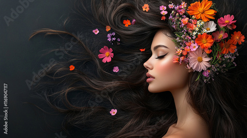 © Elżbieta Kaps, Obraz premium Piękna kobieta z kwiatami we włosach, wiosenne tło generative ai