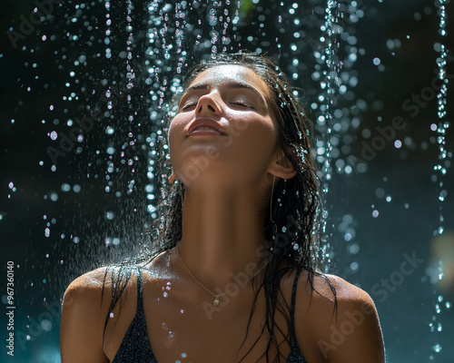 © Fotosmagoria, Obraz premium Piękna, młoda kobieta stojąca z zamkniętymi oczami pod wodospadem.