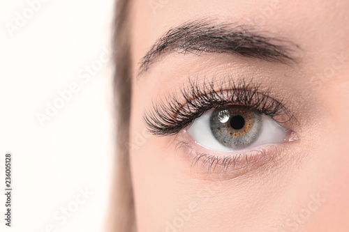 © Africa Studio, Obraz premium Piękna młoda kobieta z przedłużaniem rzęs na białym tle, zbliżenie