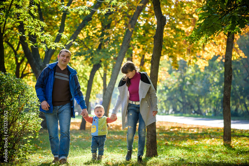 © pahis, Obraz premium Piękna młoda rodzina na spacerze w lesie jesienią na tle drzew klonowych żółtych. Ojciec i matka trzymają syna na rękach. Szczęśliwy rodzinny wypoczynek razem koncepcja