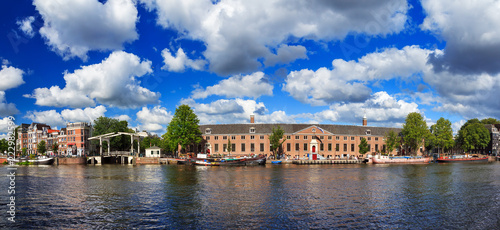 © dennisvdwater, Fototapeta premium Piękna panoramiczna panorama muzeum Ermitaż nad rzeką Amstel w Amsterdamie, w Holandii, w słoneczny letni dzień z chmurami