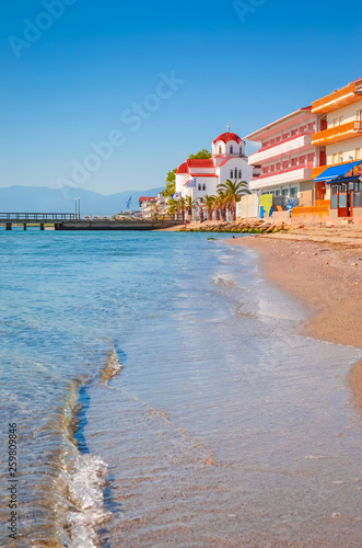 Obraz premium Piękna plaża i kościół Paralia Katerini, Grecja