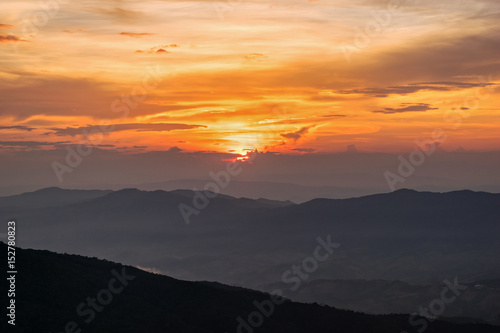 © yongkiet, Fototapeta premium Piękna przyroda krajobraz na górze z mgły chmury słońca i jasne kolory nieba i słońca podczas zachodu słońca w zimie w punkcie widzenia Phu Chi Fa Forest Park w prowincji Chiang Rai, Tajlandia