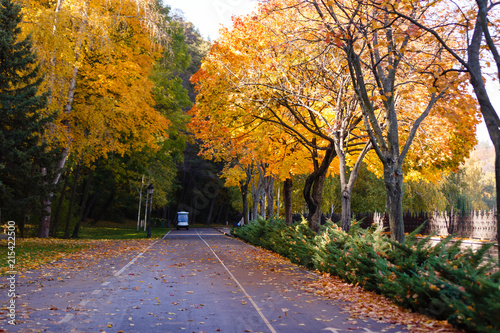 © Angelov, Naklejka premium Piękna romantyczna aleja w parku z kolorowymi drzewami i słońcem. jesień naturalne tło