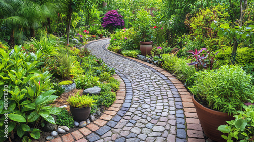 © Sawyer0, Obraz premium Piękna ścieżka ogrodowa z brukowanym chodnikiem, otoczona bujną roślinnością i kwiatami w donicach.