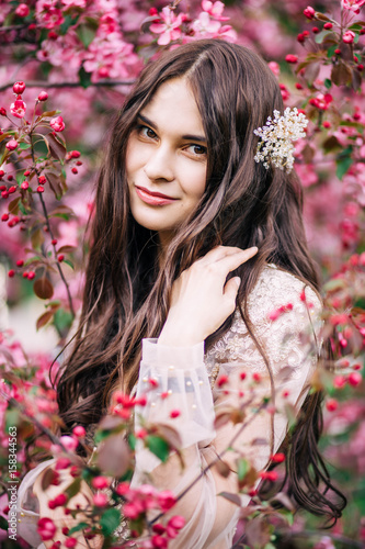 © liliyabatyrova, Fototapeta premium piękna śliczna panna młoda brunetka w przezroczystej sukience z buduaru, z dekoracją na włosach, uśmiechnięta, rozglądająca się po drzewie kwiaty z różowymi kwiatami