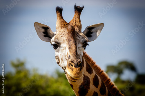 Naklejka premium Piękna zaciekawiona żyrafa Rothschilda patrząca prosto w kamerę podczas...