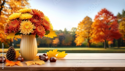 © Monika, Fototapeta premium Piękne, kolorowe chryzantemy na drewnianym blacie. W tle jesienny ogród i las. Jesienne tło