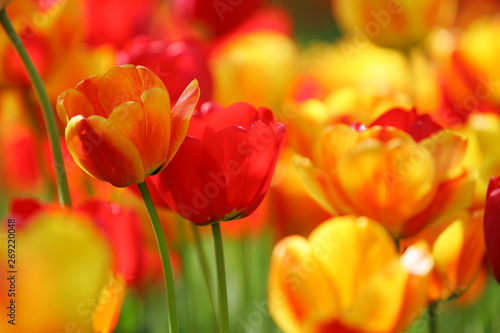 Fototapeta premium Piękne kolorowe czerwone i żółte tulipany na polu, pocztówce lub kartce z życzeniami na Wielkanoc i Dzień Matki