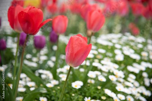 © Meaw, Obraz premium Piękne pole tulipanów i światło słoneczne latem