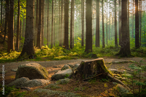 © cegli, Fototapeta premium Piękne promienie porannego słońca w zielonym lesie.