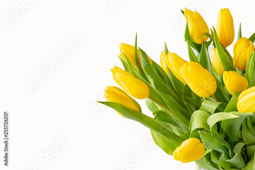 Fototapeta premium Piękne żółte tulipany z liśćmi na białym tle. Wiosenne kwiaty i rośliny. Tła wakacje