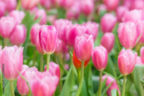 © aum1956, Fototapeta premium Piękny bukiet różowy tulipanów kwiat pole