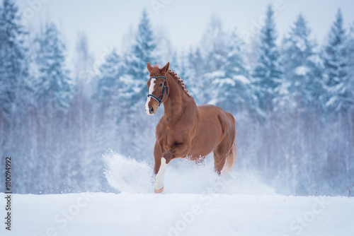 © Rita Kochmarjova, Fototapeta premium Piękny czerwony koń w śniegu w zimie