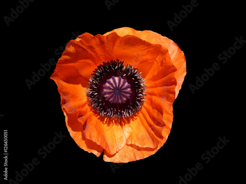 © SINNBILD Design, Naklejka premium Piękny czerwony mak z góry, w pełni otwarty, odizolowany na czarnym tle