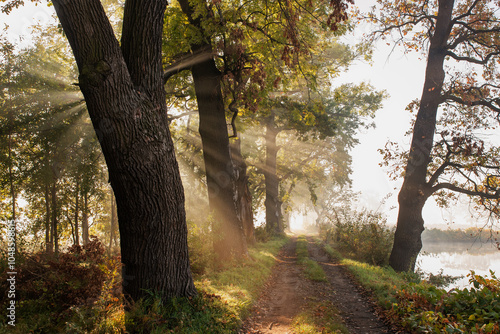 © Elżbieta Kaps, Naklejka premium Piękny jesienny krajobraz z mgłą i promieniami słońca o wschodzie, tapeta, Czechowice Dziedzice.