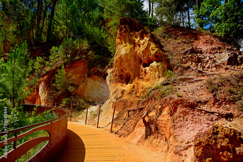 Fototapeta premium piekny kanion ochrowy z drewnianą ścieżką w Prowansji, Francja, beautiful ocher canyon in Provence, Le Sentier des Ocres, ocher trail in Roussillon, Vaucluse, Provence, France