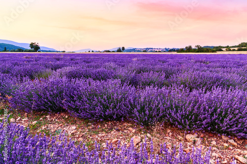 Naklejka premium Piękny krajobraz pól lawendy o zachodzie słońca w pobliżu Sault