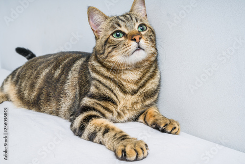 Naklejka premium Piękny, krótkowłosy kot leżący na łóżku w domu