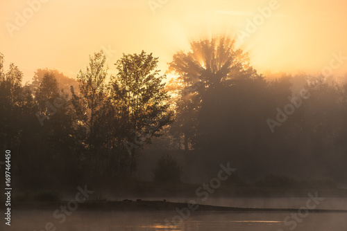 © Elżbieta Kaps, Fototapeta premium Piękny mglisty poranek nad wodą, w Kaniowie na śląsku, żwirownia.