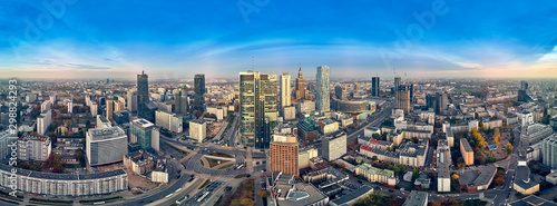 © udmurd, Obraz premium Piękny panoramiczny widok z drona na panoramę miasta Warszawy, nowoczesnego miasta, PKiN i biurowca "Rondo 1" przy Rondzie ONZ