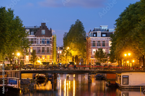 © dennisvdwater, Fototapeta premium Piękny pejzaż słynnych kanałów w Amsterdamie, w Holandii, w nocy z lustrzanym odbiciem