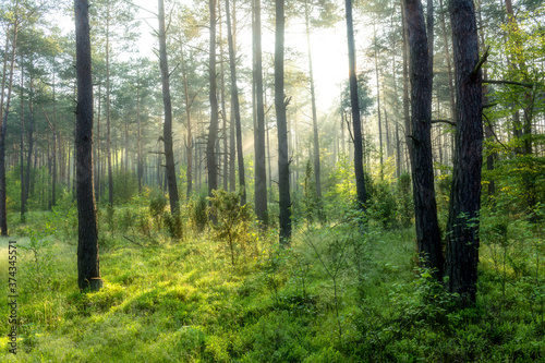© Piotr Krzeslak, Obraz premium Piękny słoneczny poranek w lesie