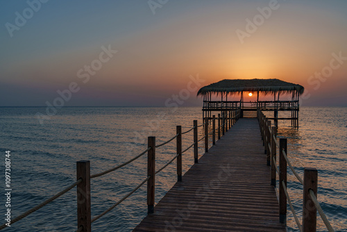 Obraz premium Piękny widok na wschód i zachód słońca nad horyzontem morskim z molo na...