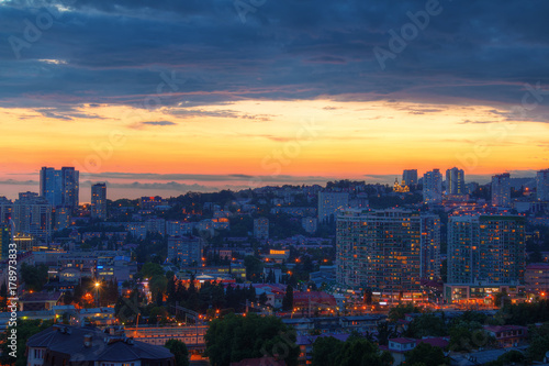 © dr_verner, Fototapeta premium Piękny widok z lotu ptaka iluminujący miasto Sochi na tle rozjarzony niebo przy zmierzchem, Rosja