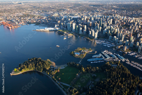 © edb3_16, Fototapeta premium Piękny widok z lotu ptaka na centrum Vancouver, Kolumbia Brytyjska, Kanada, podczas jasnego wiosennego zachodu słońca.