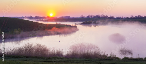 Fototapeta premium Piękny wschód słońca nad zamglonym jeziorem