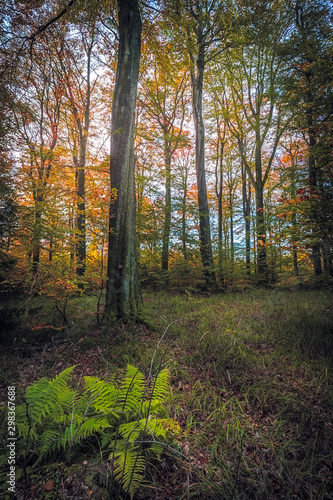 © RAW Digital Studio, Obraz premium Piękny zachód słońca w lesie, jesienne kolory lasu