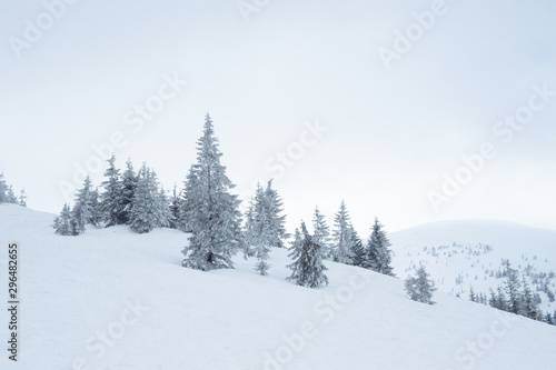 Naklejka premium Piękny zimowy krajobraz górski ze śniegiem pokryte jodły w godzinach porannych.