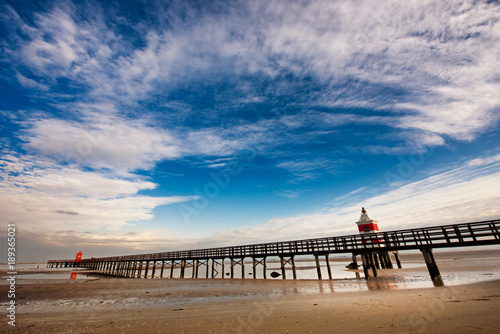 Fototapeta premium Pier and low tide in Lignano, Friuli Venezia Giulia, Italy.