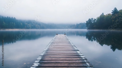 Naklejka premium Pier into the Mist: An ethereal view of a wooden pier stretching out towards a misty lake, inviting contemplation, calmness, and serene atmosphere.