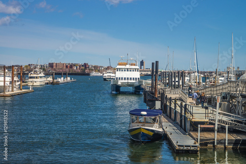 © Roman Babakin, Fototapeta premium Pier of Boston Wharf and sailboat in Charles River