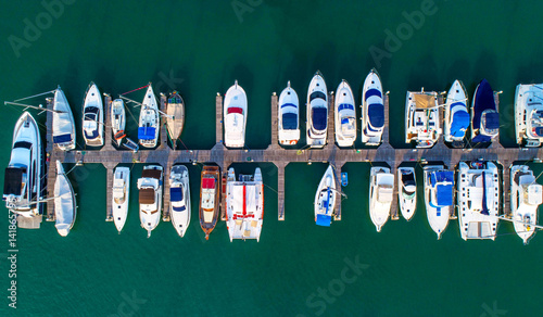 © MAGNIFIER, Obraz premium Pier speedboat. A marina lot. This is usually the most popular tourist attractions on the beach.Yacht and sailboat is moored at the quay.Aerial view by drone.Top view.